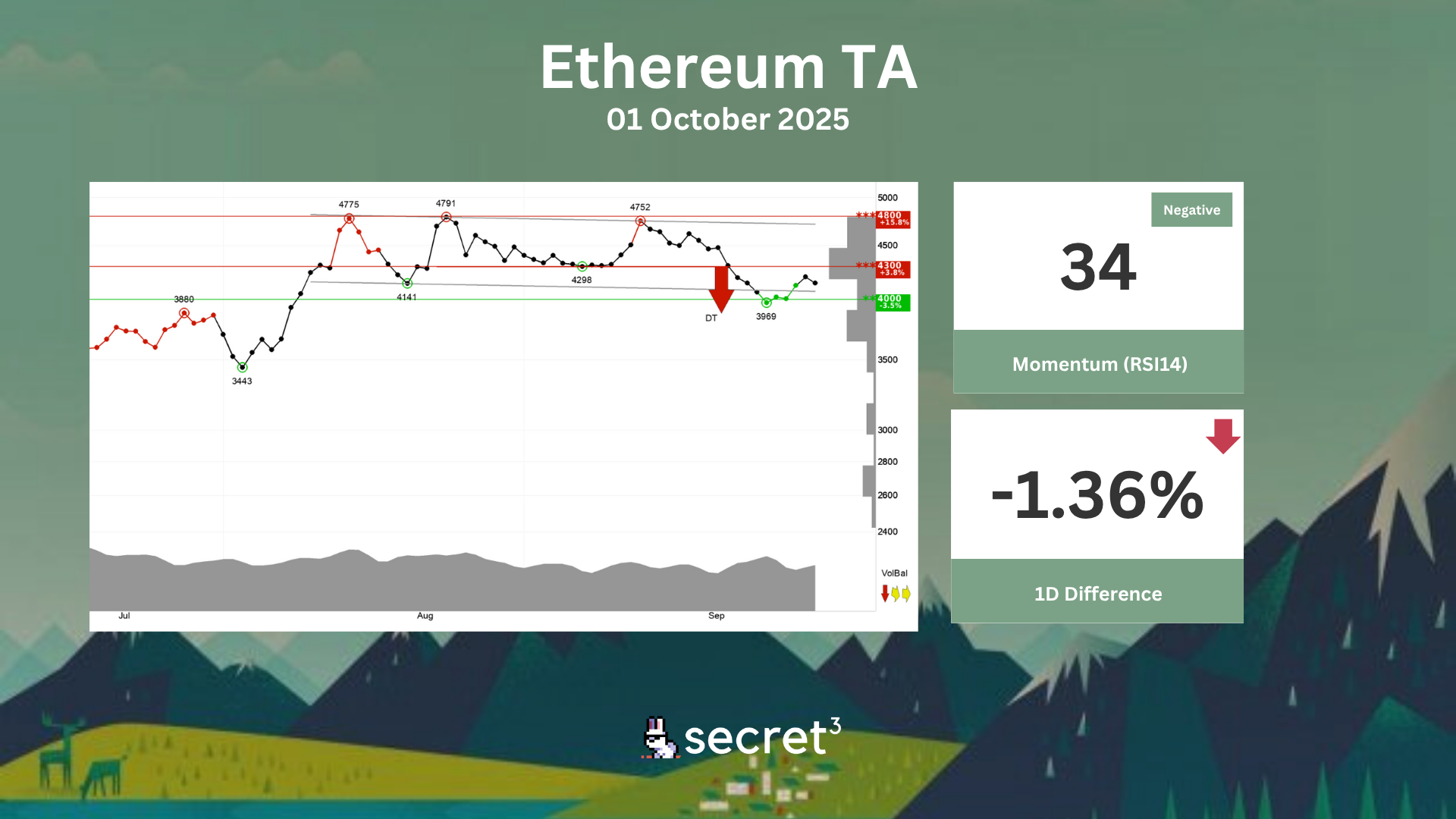 Ethereum - Ethereum is within an approximate horizontal trend channel in the short term, which indicates further development in the same direction. The currency gave a negative signal from the double top formation by the break down through the support at 4298. Further fall to 3878 or lower is signaled. The currency is between support at points 4000 and resistance at points 4300. A definitive break through of one of these levels predicts the new direction. The RSI curve shows a falling trend, which is an early signal of a possible trend reversal downwards for the price as well. The currency is overall assessed as technically negative for the short term.
