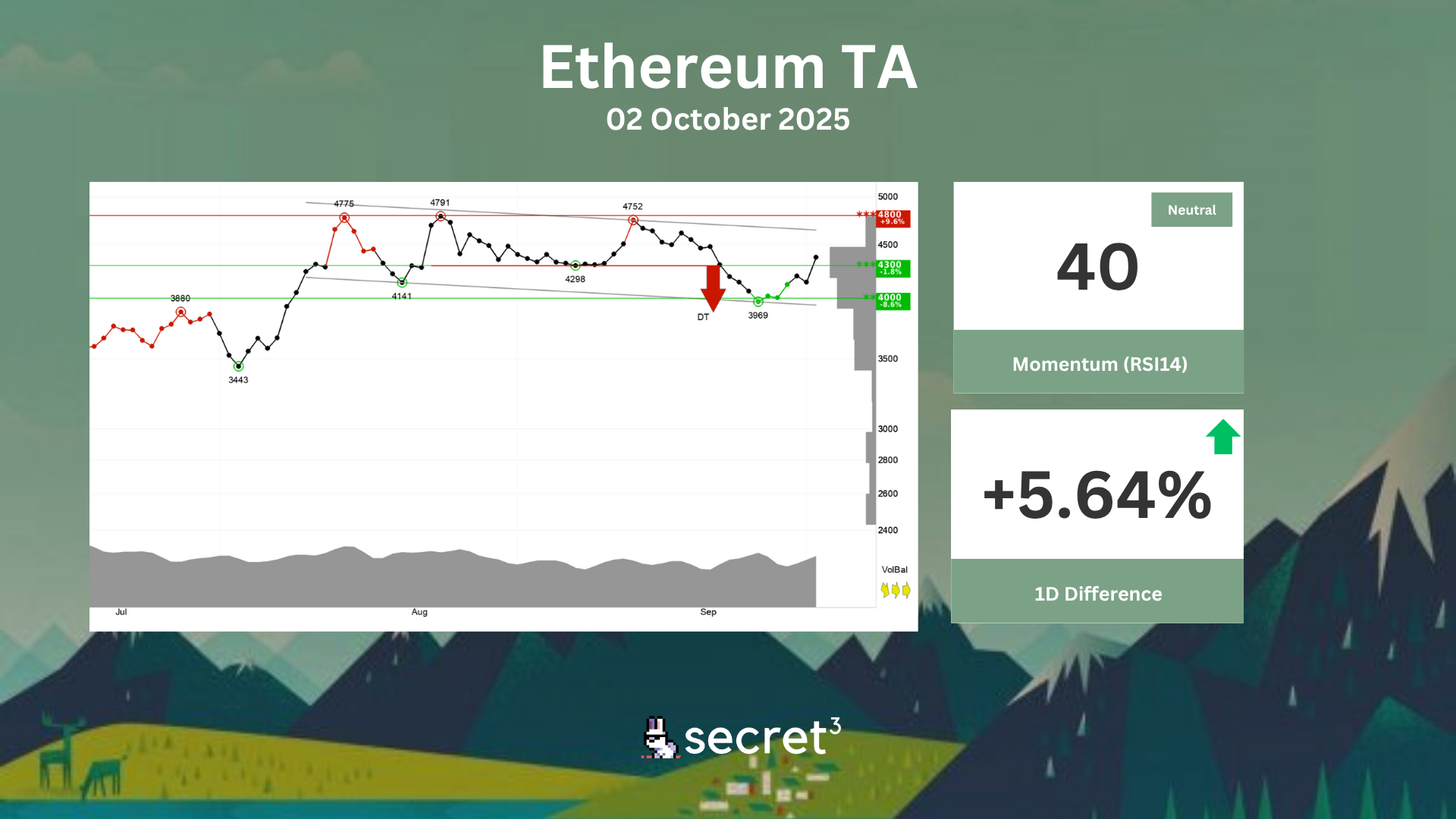 Ethereum - Ethereum is within an approximate horizontal trend channel in the short term. This indicates that investors are uncertain and waiting for signals of further direction. A break upwards will be a positive signal, while a break downwards will be a negative signal. The price has reacted back after a break of the double top formation without quite reaching the objective at 3878. A significant break 4298 will again give new negative signals to the currency, while a break of the opposite side of the formation will be a strong positive signal. The currency has broken up through resistance at points 4300. This predicts a further rise. In case of negative reactions, there will now be support at points 4300. The RSI curve shows a falling trend, which is an early signal of a possible trend reversal downwards for the price as well. The currency is overall assessed as technically slightly positive for the short term.