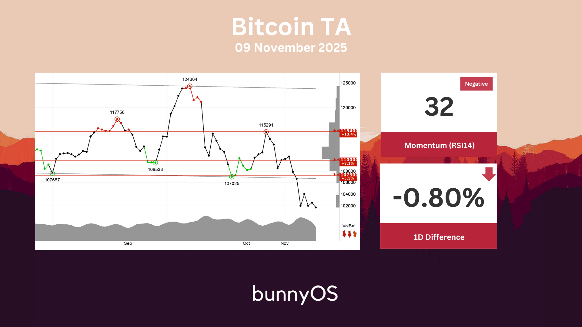 Bitcoin - An approximate horizontal trend channel in the short term is broken down. A continued weak development is indicated, and the currency now meets resistance on possible reactions up towards the trend lines. There is no support in the price chart and further decline is indicated. In case of a positive reaction, the currency has resistance at 107300 points. Negative volume balance shows that volume is higher on days with falling prices than days with rising prices. This indicates decreasing optimism among investors. The RSI curve shows a falling trend, which could be an early signal of the start of a falling trend for the price as well. The currency is overall assessed as technically negative for the short term.