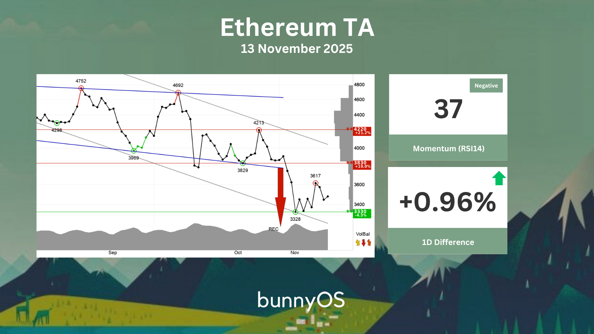 Ethereum - Ethereum shows weak development in a falling trend channel in the short term. This signals increasing pessimism among investors and indicates further decline for Ethereum. The currency gave a negative signal from the rectangle formation by the break down through the support at 3777. Further fall to 3189 or lower is signaled. The currency has support at points 3330 and resistance at points 3830. Volume has previously been low at price tops and high at price bottoms. Volume balance is also negative, which confirms the trend. The currency is overall assessed as technically negative for the short term.