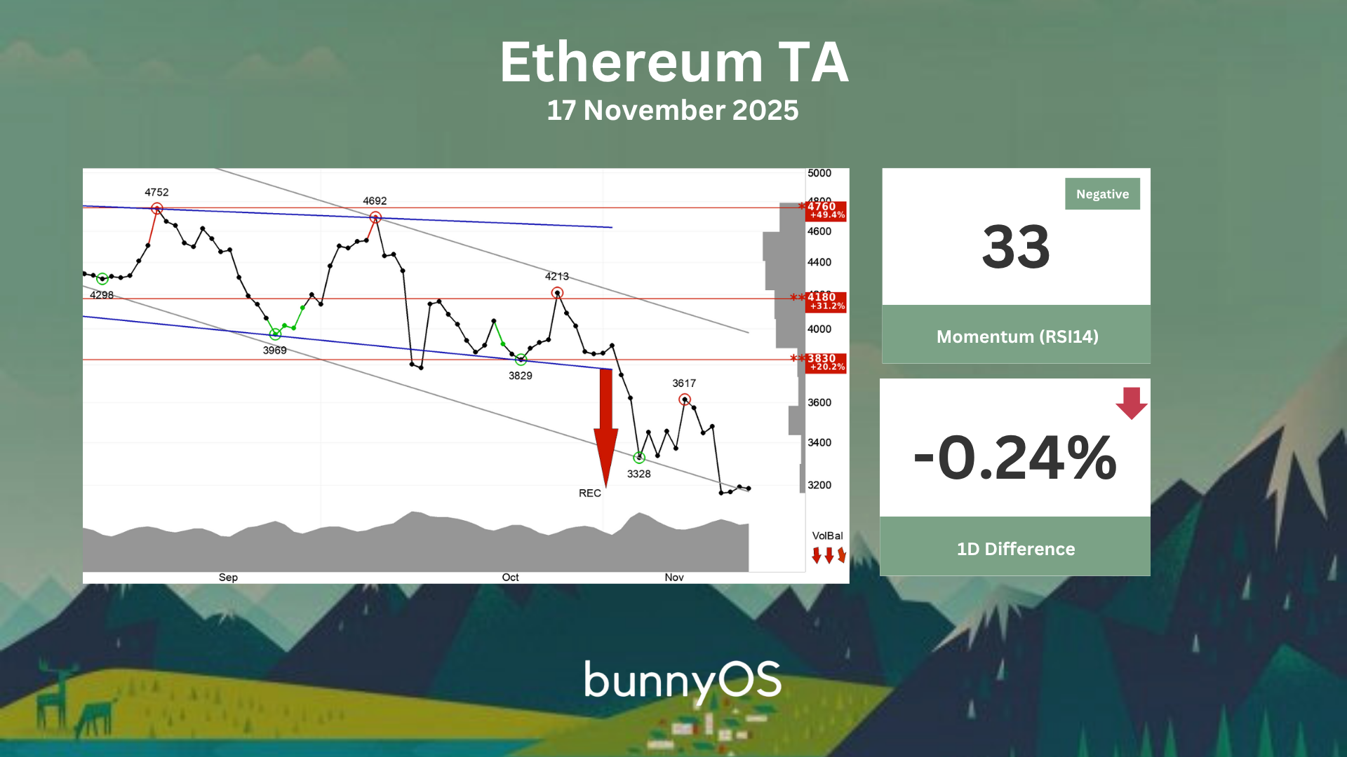 Ethereum - Ethereum is in a falling trend channel in the short term. This shows that investors over time have sold at lower prices to get out of the currency, and indicates negative development for the currency. The currency has met the objective at 3184 after the break of the rectangle formation. The price has now risen again, but the formation indicates a further fall. There is no support in the price chart and further decline is indicated. In case of a positive reaction, the currency has resistance at 3830 points. Volume has previously been low at price tops and high at price bottoms. Volume balance is also negative, which confirms the trend. The currency is overall assessed as technically negative for the short term.