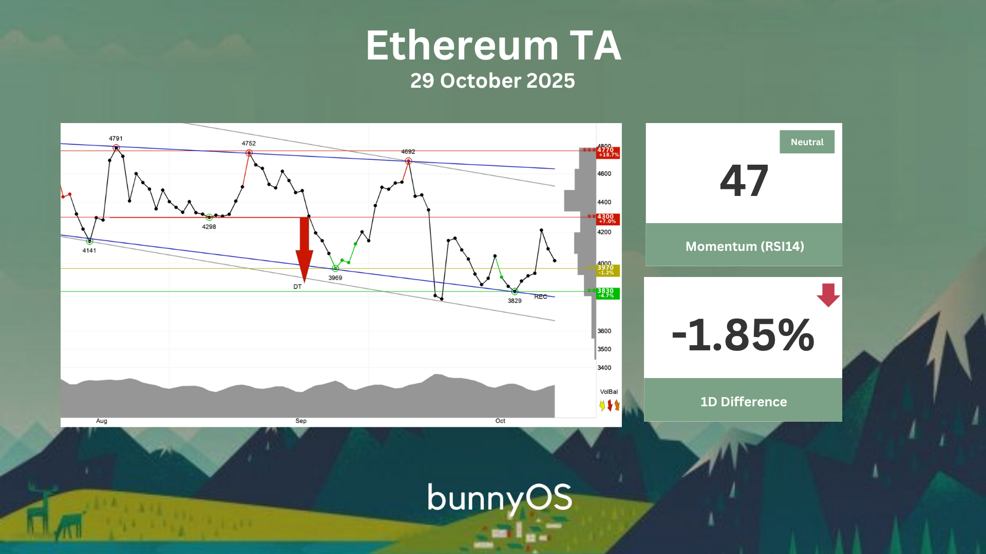 Ethereum - Ethereum is in a falling trend channel in the short term. Falling trends indicate that the currency experiences negative development and falling buy interest among investors. The currency is moving within a rectangle formation between support at 3798 and resistance at 4638. A decisive break through one of these levels indicates the new direction for the currency. The currency is approaching support at 3970 points, which may give a positive reaction. However, a break downwards through 3970 points will be a negative signal. Volume has previously been low at price tops and high at price bottoms. Volume balance is also negative, which confirms the trend. The RSI curve shows a rising trend, which is an early signal of a possible trend reversal upwards for the price as well. The currency is overall assessed as technically negative for the short term.